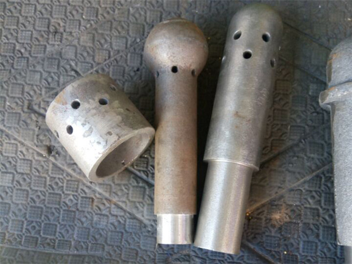 我公司生產(chǎn)的新型鐘罩式風(fēng)帽,優(yōu)于蘑菇狀多孔風(fēng)帽,蘑菇狀孔眼多,孔徑小,送風(fēng)出孔角度與帽身為90°,90°布風(fēng)在送風(fēng)風(fēng)壓波動(dòng)時(shí)物料會(huì)通過風(fēng)帽孔回吸進(jìn)入風(fēng)室,造成風(fēng)室積渣,風(fēng)帽通風(fēng)不足,過熱損壞,風(fēng)帽數(shù)量多,間距小易造成風(fēng)帽間相互對(duì)吹,致使風(fēng)帽頭部磨損嚴(yán)重?fù)p壞。它同時(shí)優(yōu)于7字型和T型風(fēng)帽,其中7字型風(fēng)帽為單孔,出口角度與帽身呈90°直角或15°、30°斜角,而T型風(fēng)帽為雙孔或多孔,兩孔與帽身均呈一定角度。這兩種型號(hào)式風(fēng)帽雖然孔徑大,但無法避免對(duì)吹磨損,風(fēng)室積渣現(xiàn)象。